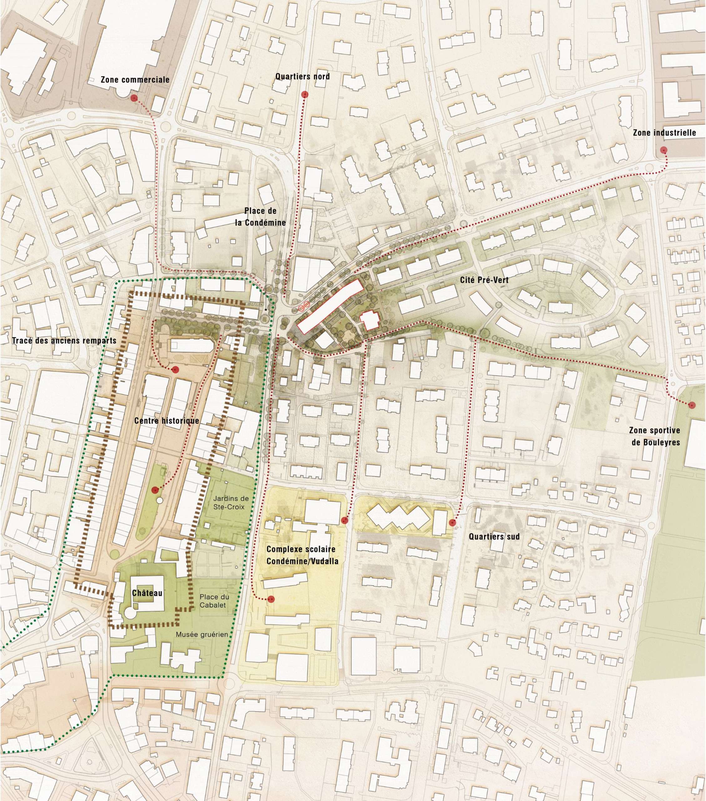Ce MEP a porté sur deux secteurs aux portes de la vieille ville de Bulle. Le premier concernait la requalification des espaces publics des routes de Condémines, Morlon et de la Poterne, et le second, attenant au premier et soumis au PAD « Cité Pré-Vert », visait une densification de qualité et la création d’un parc urbain.
