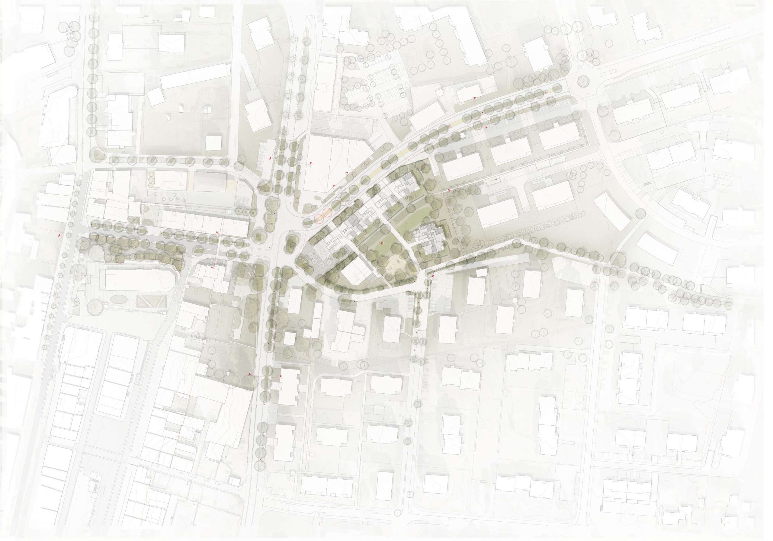 Le périmètre du projet se trouve dans un lieu de convergence de plusieurs tissus morphologiques et d’axes routiers différents. A l’ouest, le tissu historique de la vieille ville est caractérisé par son maillage de rues et de places. Au nord et au sud, se développe un quartier de logements aux volumes et aux orientations disparates. Un vide de forme triangulaire se dégage entre ses deux entités, qui conflue vers un noeud réunissant tous les axes routiers.