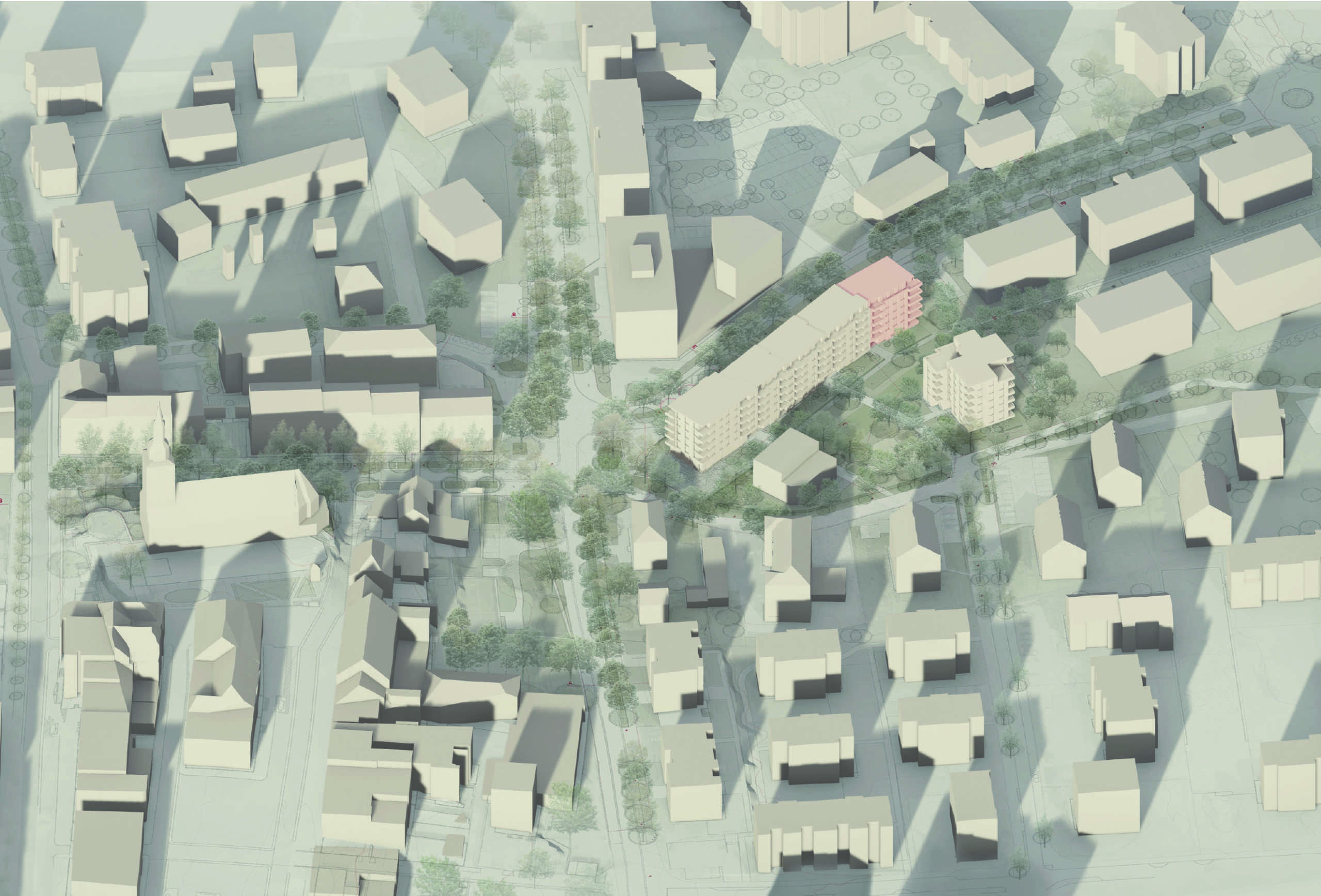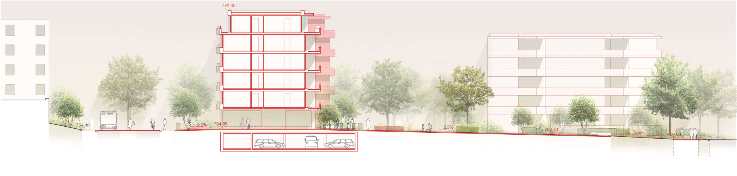 L’implantation des futurs bâtiments reconnaît la situation d’entre-deux de ce morceau de ville, en occupant ses franges le long des rues et en libérant son centre pour la création d’un parc urbain. Au nord, un bâtiment linéaire est implanté le long de la route de Morlon dans la continuité des volumes existants le long de cet axe. Au sud, un volume plus libre favorise une plus grande perméabilité avec le tissu bâti voisin.
