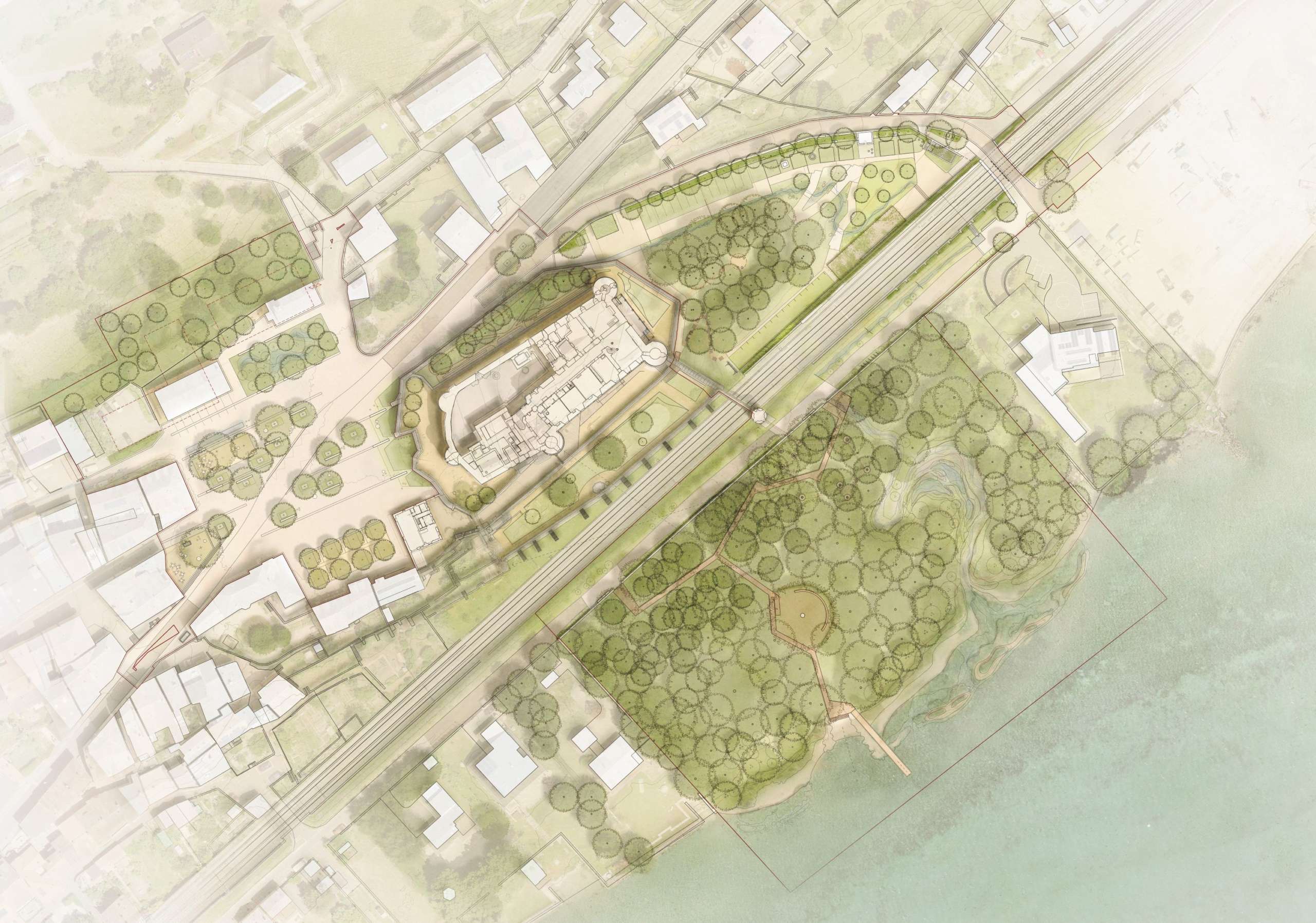 Le projet repose sur une analyse fine du contexte paysager et historique des deux parcs en relation avec le château. Il reconnaît la lente stratification des évènements ayant conduit à la situation actuelle, de la butte originelle dans le Parc du Château aux plantations plus ornementales des terres exondées du Parc du Lac, en passant par le passage offert par Gustave de Blonay sous la digue ferroviaire nouvellement construite. Cette compréhension de la façon dont le site s’est façonné à travers le temps fait émerger des permanences sur lesquelles se fonde le projet.