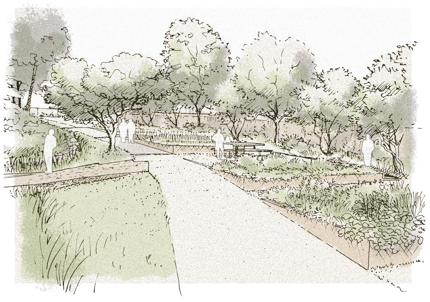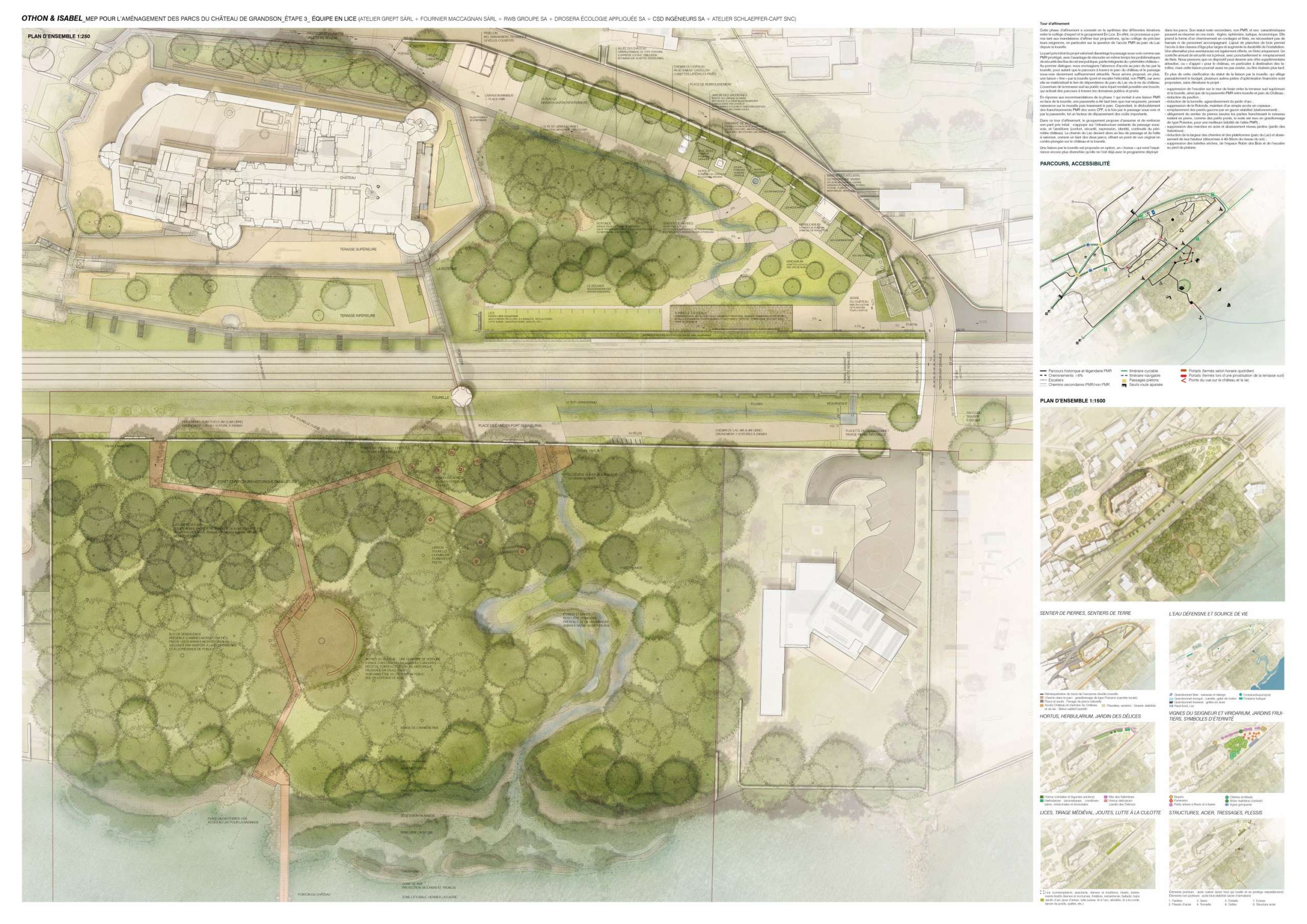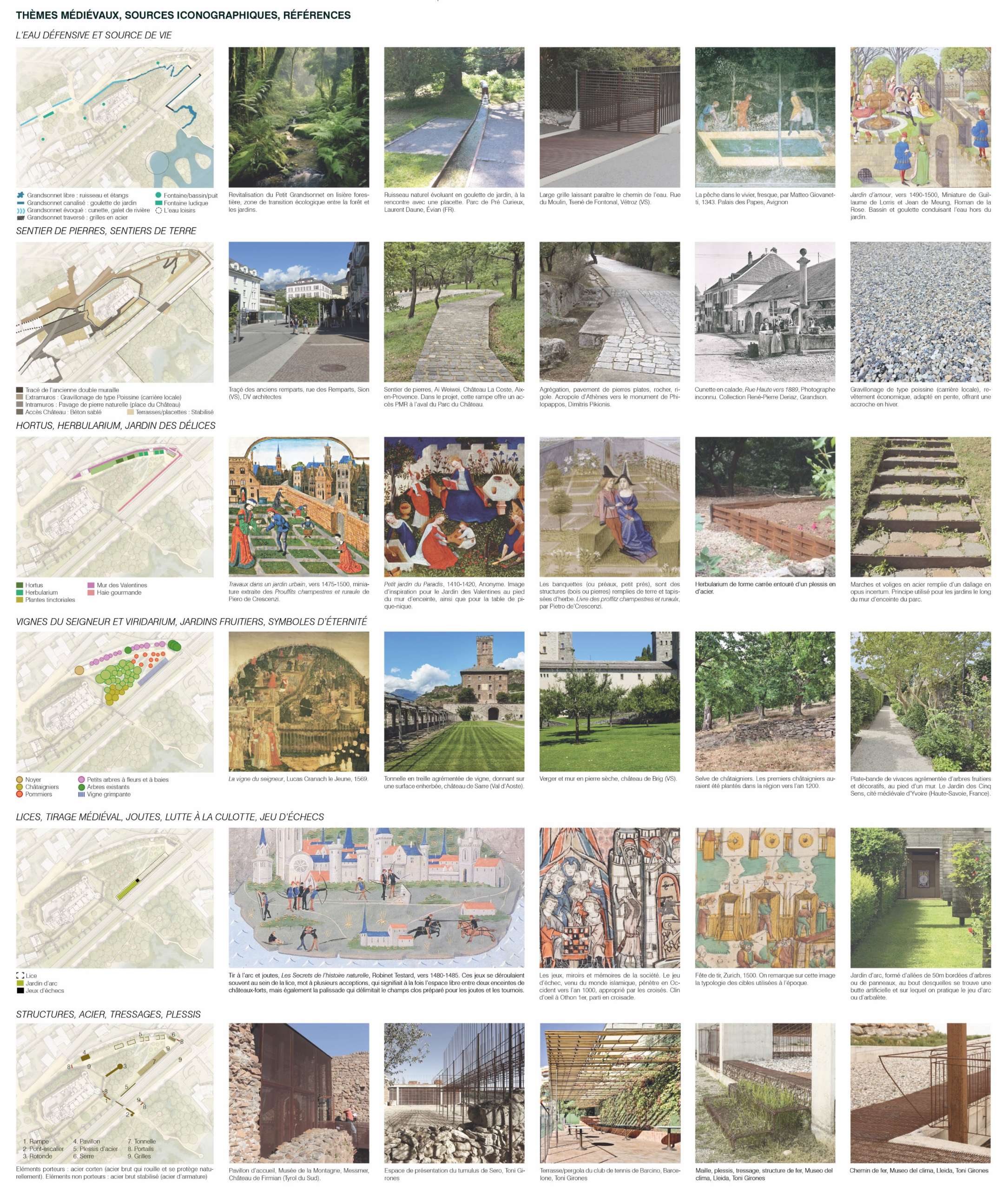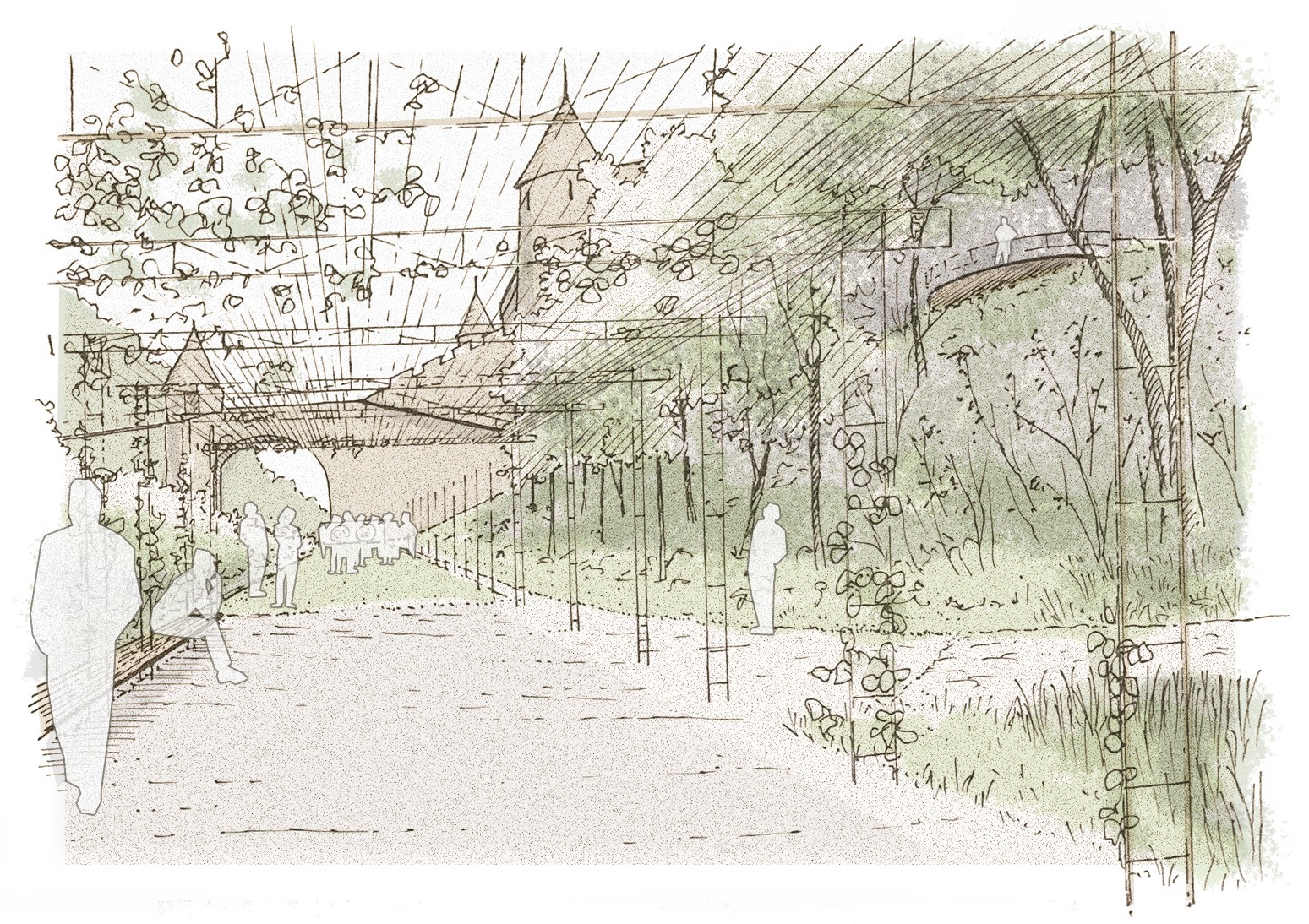 Dans le Parc du Château, la proposition rend hommage à l’héritage culturel des seigneurs de Grandson à travers une évocation de pratiques et traditions médiévales. Le sommet de la butte devient une rotonde végétale où l’on récite et écoute. Le Petit-Grandsonnet remis à ciel ouvert révèle la topographie subtile du vallon et forme le fi l conducteur des aménagements. Le long du mur longeant le chemin du Château, une succession de pavillons et jardins de simples accueille les di érentes fonctions jusqu’à la serre réhabilitée. Un chemin en pente douce conduit à la partie plane du parc, évoquant la lice où se déroulaient les joutes, qui pourra notamment être dédiée au tir à l’arbalète.