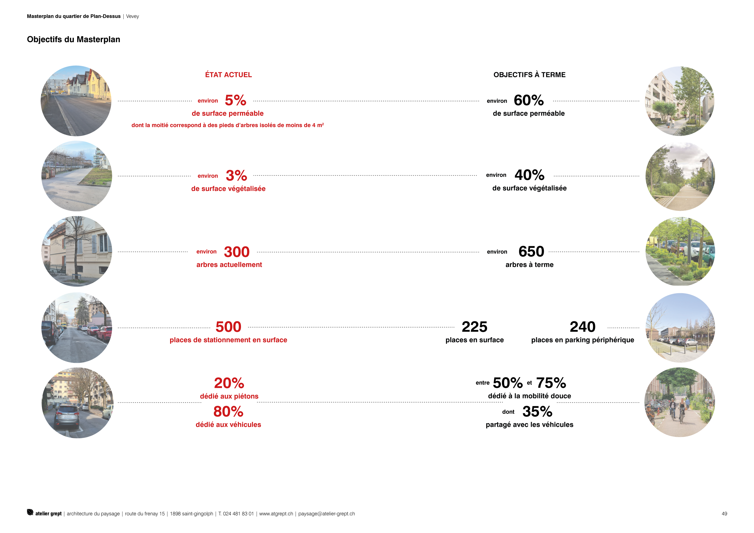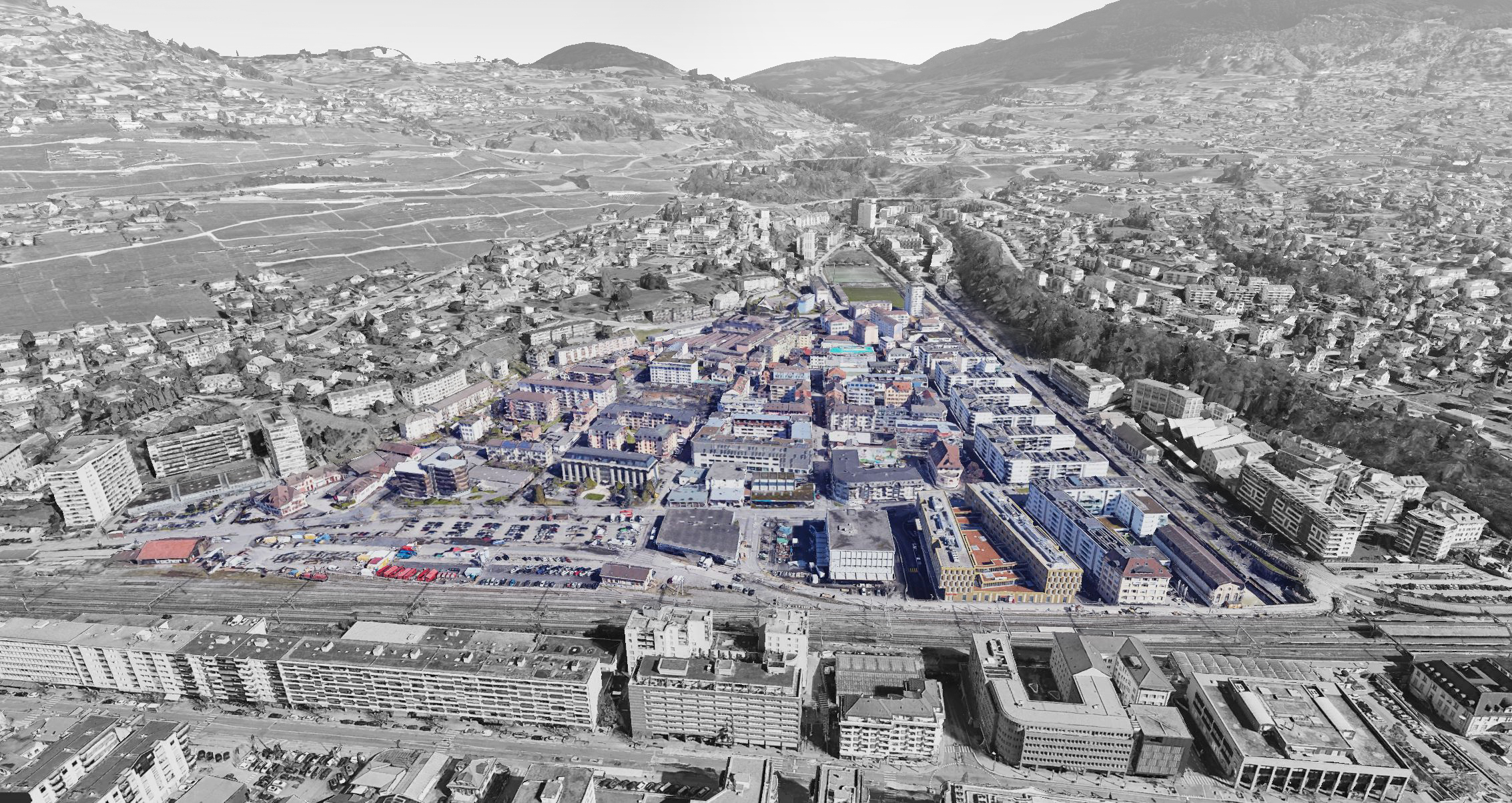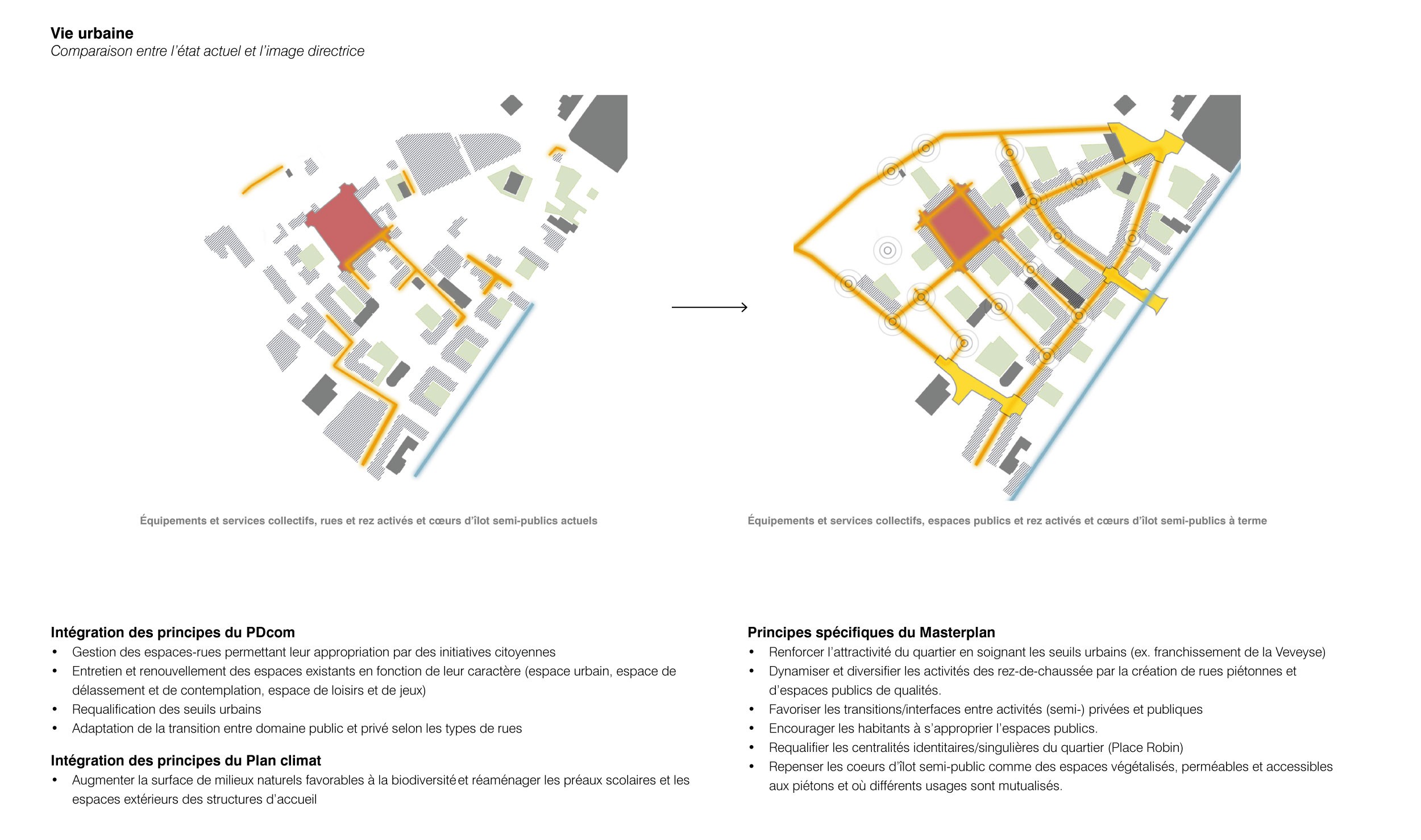 Le Masterplan s’appuie sur la synthèse des études qui l’ont précédé. Il constate les limites urbaines et naturelles marquées qui ont enclavé le quartier par rapport au reste de la ville (les voies de chemin de fer au sud, la Veveyse à l’est et la colline de Corsier à l’ouest). Cette situation singulière a contribué à forger une forte identité de quartier. Les rues caractéristiques en damier formant des îlots bâtis, s’organisent dans cet espace contraint en unités concentriques, du centre vers la périphérie. Chaque îlot est construit autour d’une cour intérieure (ou coeur d’îlot) ouverte sur les rues. Au croisement des rues, l’espace libre s’élargit grâce aux angles à 45° des îlots bâtis. La place Robin, lieu identitaire pour les habitants, s’inscrit dans cette trame orthogonale, offrant un vide en lieu et place d’un îlot, vers lequel convergent les parcours piétons.
