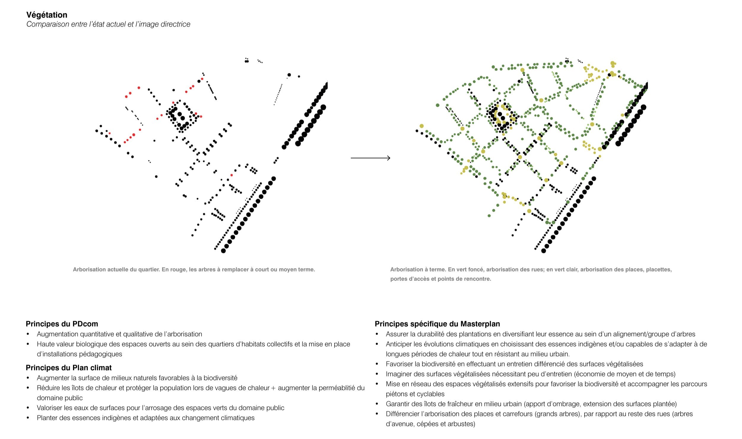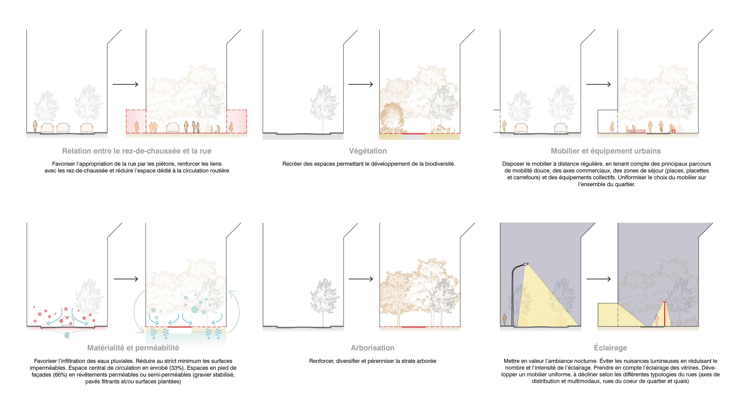 Différentes typologies de rues, carrefours et promenades répondent aux différentes fonctions et situations spécifiques au sein du quartier. Ces typologies répondent à la fois aux exigences techniques et aux principes de requalification de l’espace public du Plan directeur communal. Elles sont élaborées dans une logique de résilience et de durabilité en cohérence avec le Plan climat. Le projet vise à partager équitablement l’espace public entre les différents modes de déplacement. Il invite les habitants à s’approprier cet espace partagé, favorisant ainsi l’activation des rez-de-chaussée. Les rues sont largement végétalisées d’essences et de strates diversifiées et les sols sont rendus majoritairement perméables de manière à favoriser le cycle naturel de l’eau et à limiter le phénomène d’îlot de chaleur urbain. Le mobilier et les équipements publics sont implantés à intervalles réguliers le long des rues, agrémentant l’espace public de lieu de rencontre et de délassement pour tous. Finalement, l’ambiance nocturne du quartier s’accorde aux différentes typologies de rue, en cohérence avec les besoins des habitants et dans le respect des ressources énergétiques et de la biodiversité urbaine.