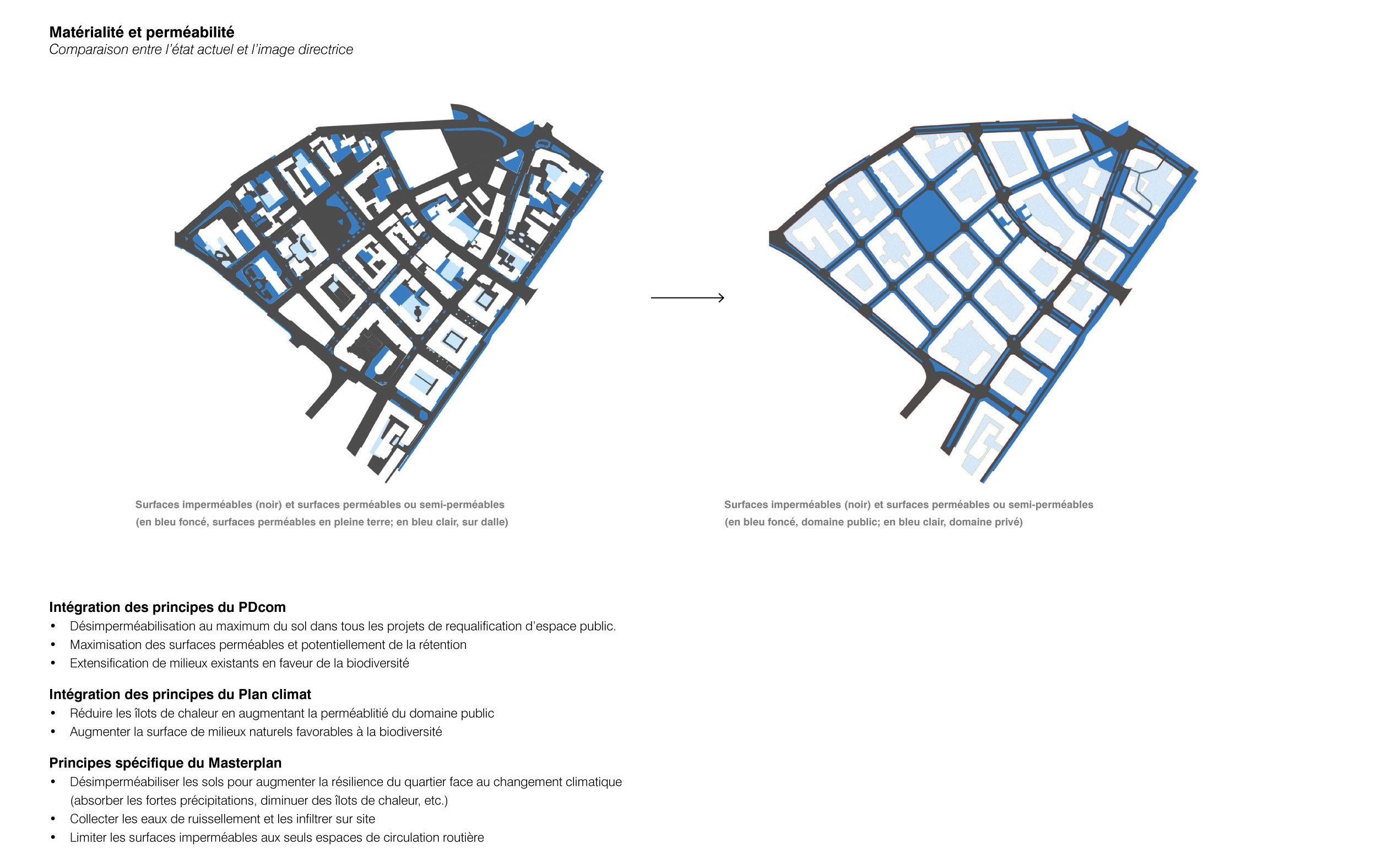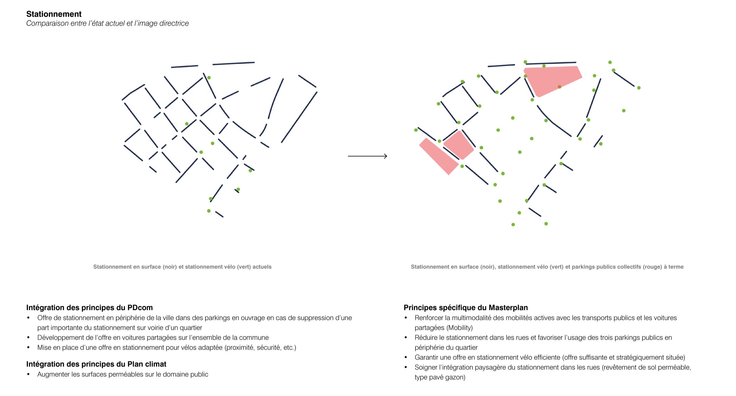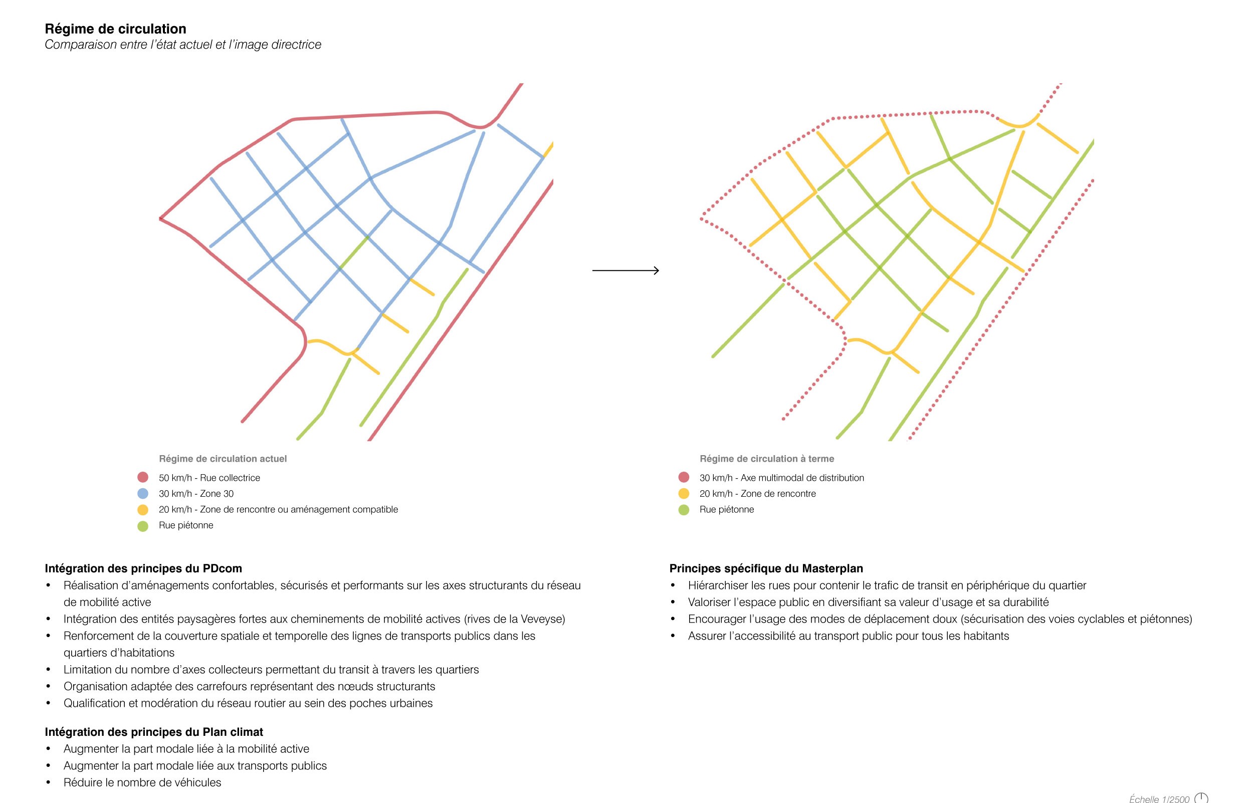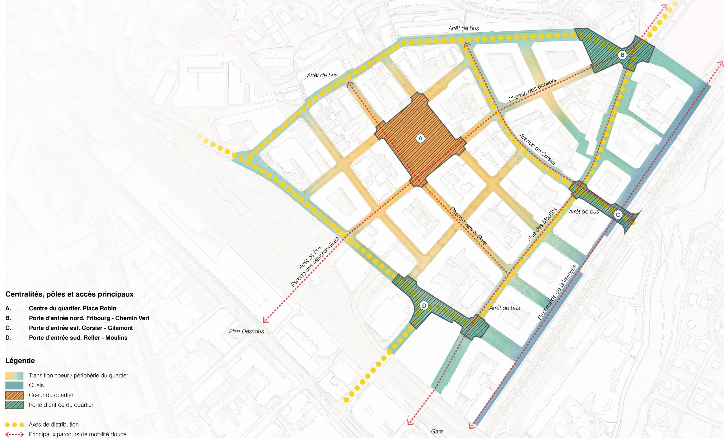 Le concept du Masterplan renforce la structure concentrique du quartier autour de la Place Robin, en partant du coeur entièrement piéton à terme, en passant par une zone de rencontre, vers la périphérie où est reporté l’essentiel des véhicules motorisés. La perméabilité avec le reste de la ville est favorisée, grâce au renforcement ou à la création de nouveaux franchissements par-delà les limites urbaines et naturelles qui enclavent le quartier. Deux axes nord-sud et est-ouest assurent la traversée et la distribution interne du quartier, pour les transports publics, piétons, vélos et les véhicules riverains qui accèdent aux parkings privés.