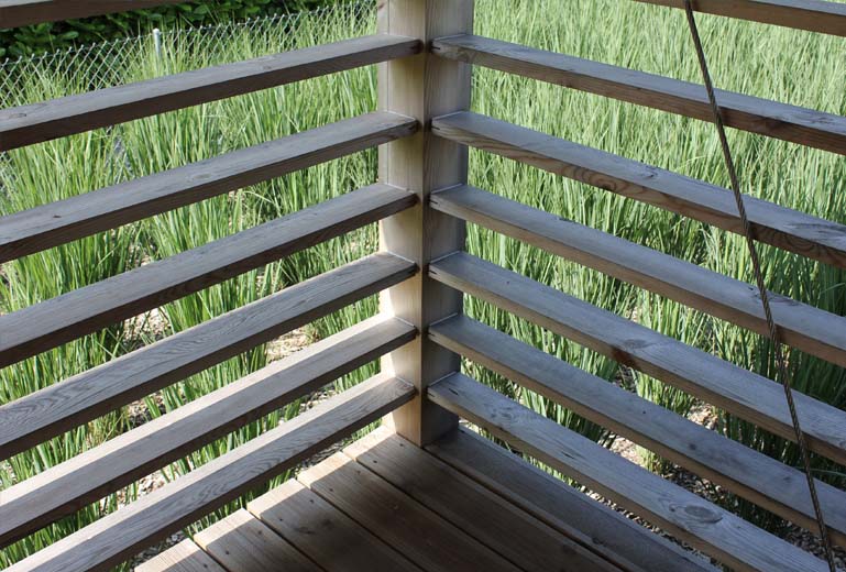 L’évocation de l’ancien marais sera l’idée forte pour ce parc. Une cabane sur pilotis, dénommée «cabane du pêcheur», s’installe au fond du parc comme la pièce maîtresse, lieu de rencontre original et ludique entre adultes et enfants du quartier ou du village. Ses cloisons tantôt opaques, tantôt ajourées, offrent de l’intimité vis-à-vis des villas voisines, tout en préservant le dégagement sur les montagnes. Cette cabane dans les feuillages est un excellent support de jeux pour les enfants du quartier, offrant de multiples cachettes et assises.