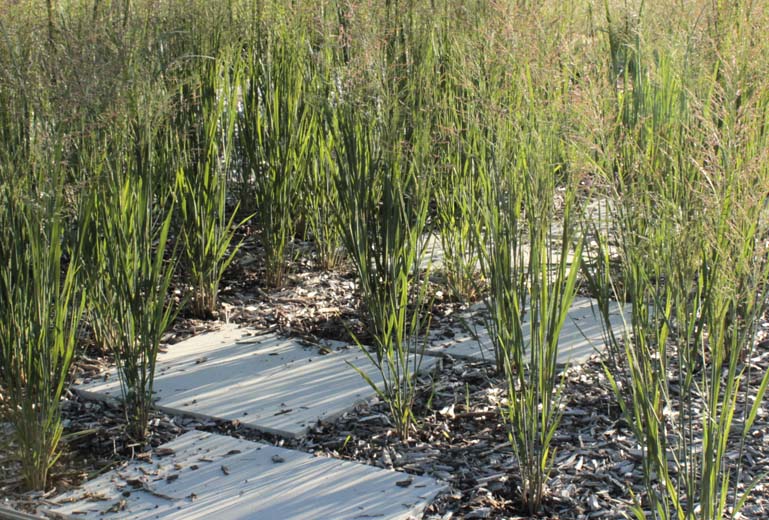 L’outil végétal est utilisé pour donner à ce lieu une ambiance de milieu humide tout en répondant aux exigences du sol, tantôt sec, tantôt humide. Le choix de plantes graminées, au feuillage fins, rappelle la flore hélophile, tout comme les saules, aux feuillages argentés, qui font référence à la végétation arbustive des marais. Des floraisons jaunes et violettes ponctueront les saisons, avec les iris et les rudbéckias, des couleurs rappelant toujours ces milieux marécageux.