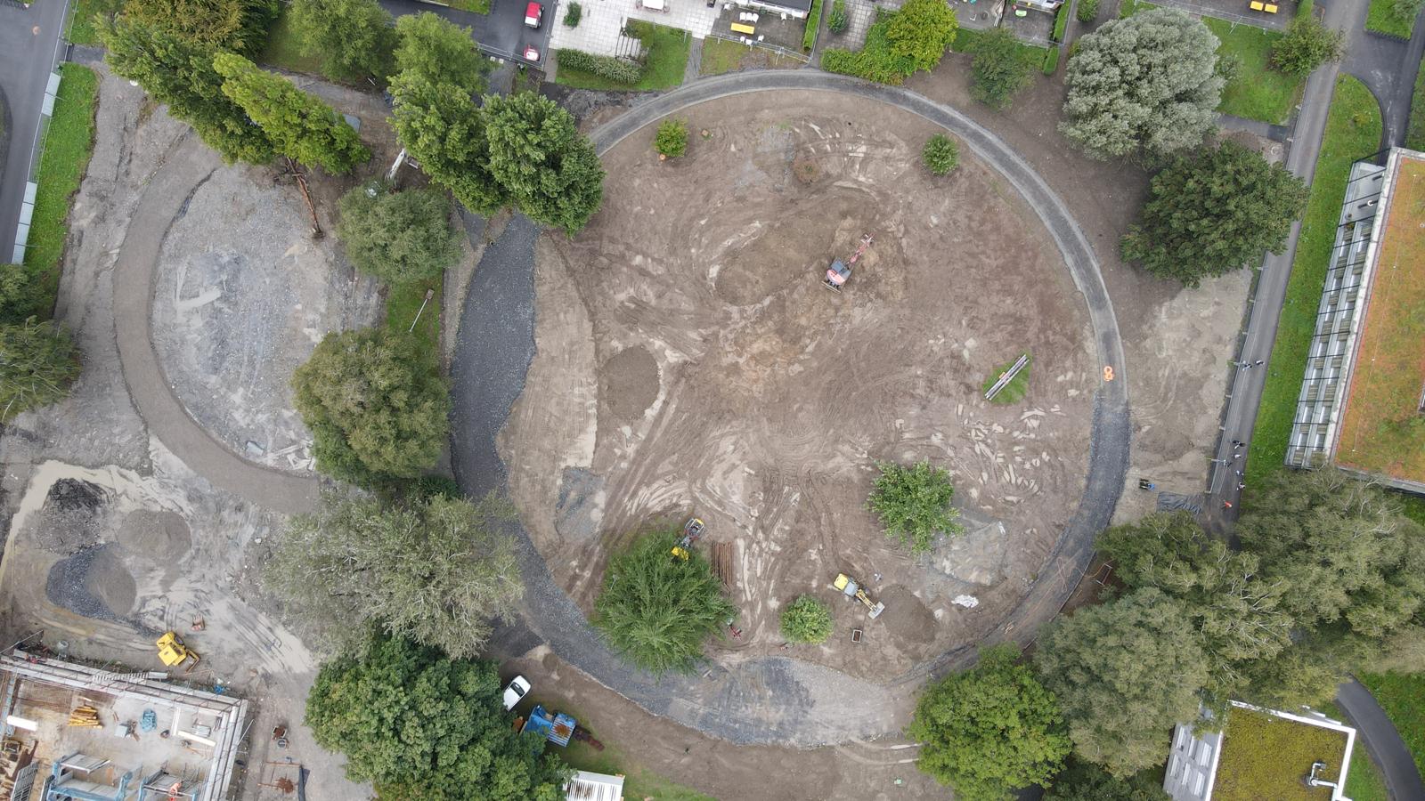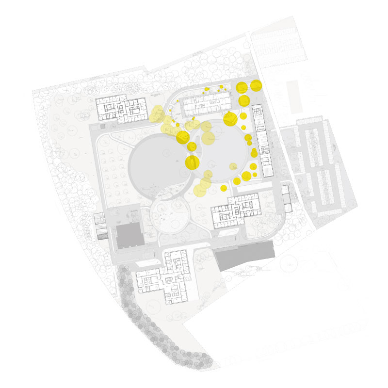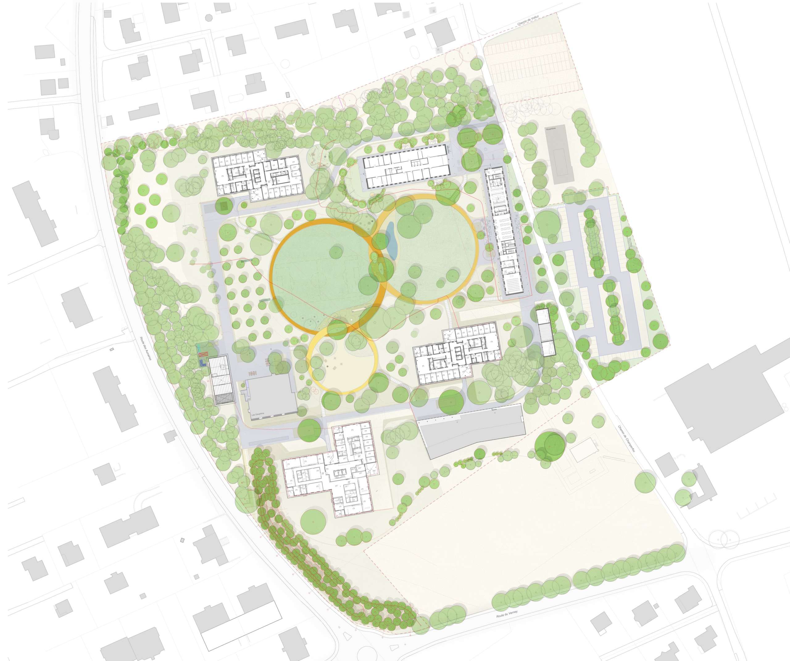 Trois cheminements circulaires colorés structurent le parc, proposant des parcours ludiques autour d’une pelouse d’agrément, d’un biotope et d’une place de rassemblement pour les activités en plein air, tandis qu’une circulation périphérique discrète assure la desserte fonctionnelle du site. Ce futur parc est vu comme un support, une aide complémentaire à la thérapie et à l’éveil des jeunes en situation de handicap.