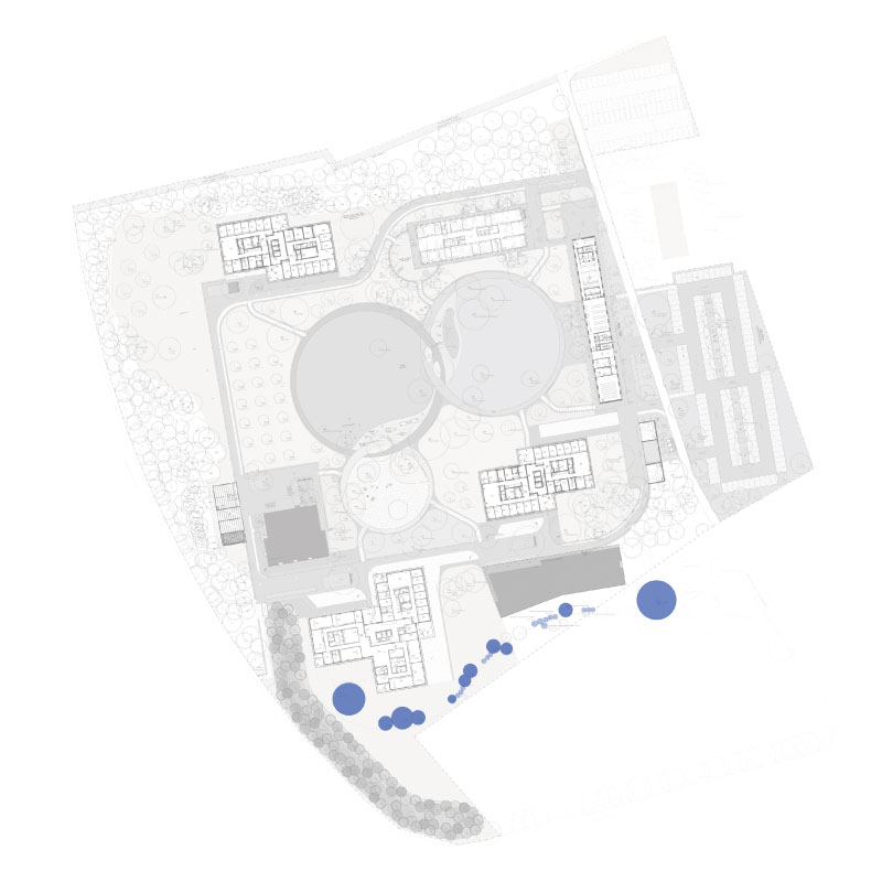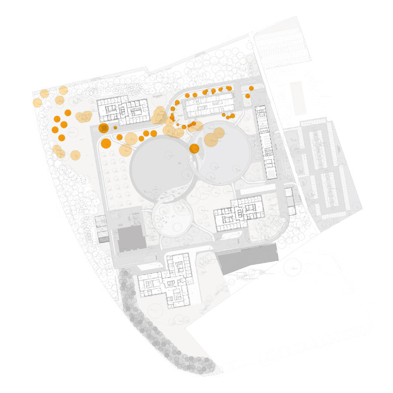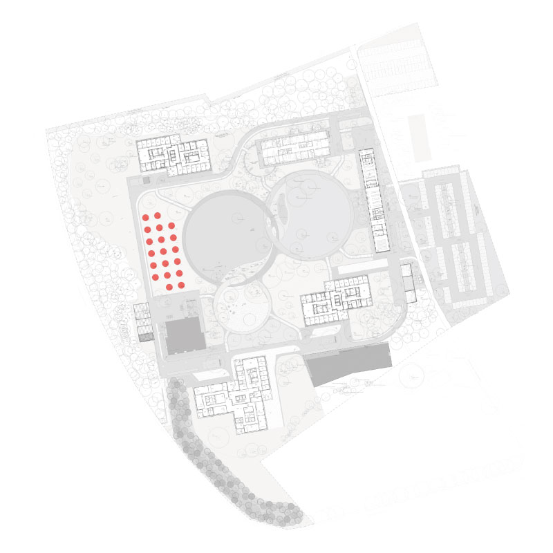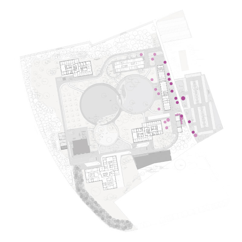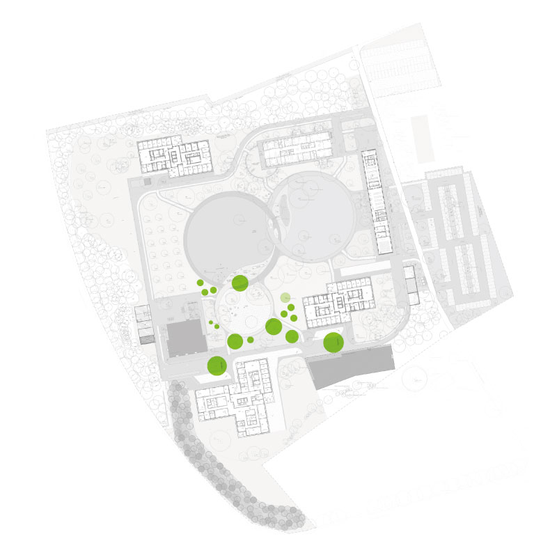 Le projet paysager cherche à renforcer l’identité particulière de ce parc et de son arboretum et de s’appuyer sur la grande diversité des plantes pour stimuler la perception sensorielle des résidents. Différents tableaux végétaux sont constitués par thèmes, comme les quatre saisons, les couleurs, les goûts et les senteurs. Les potées des loggias reprennent aussi la colorimétrie des bâtiments.