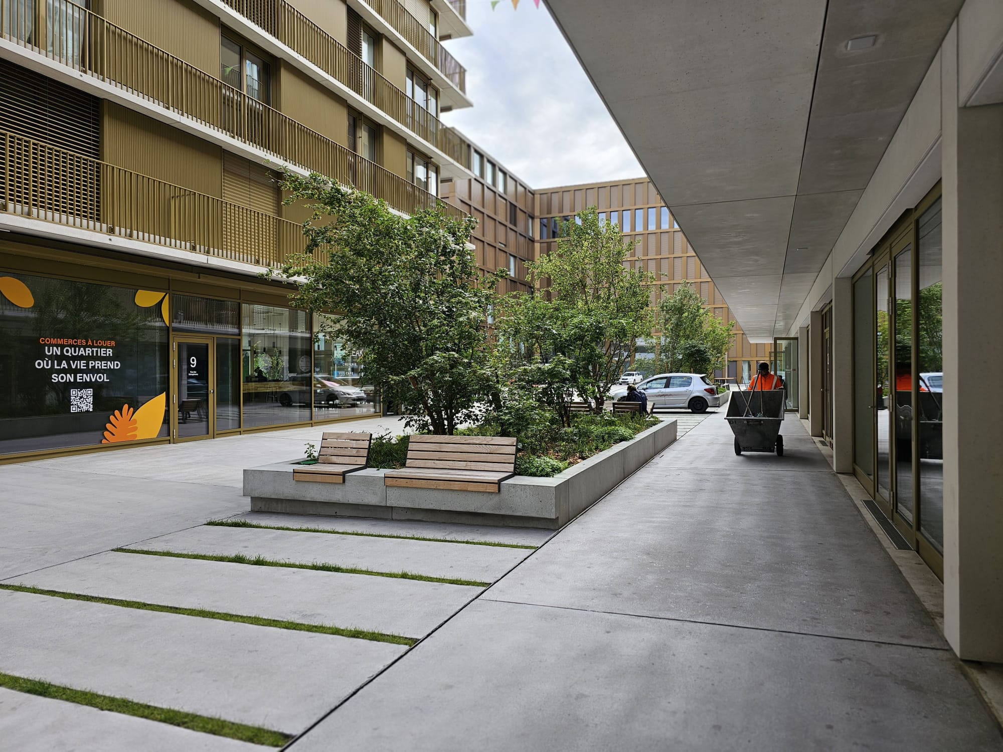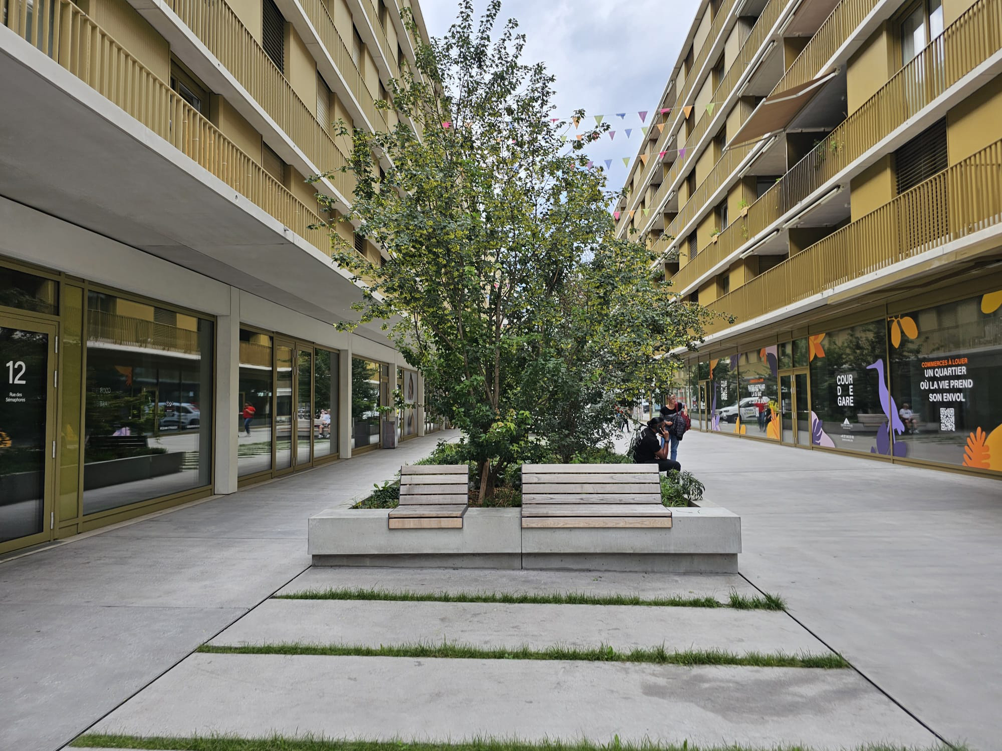 Sur la rue sud, des bacs plantés évoquent des wagons-chariots. Les « rails » sont dessinés par les caniveaux à fente bordant la bande centrale. En plus d’offrir également l’épaisseur de terre suffisante pour les plantations, ils sont le support d’assises sur leur pourtour ainsi que d’éclairage nocturne.