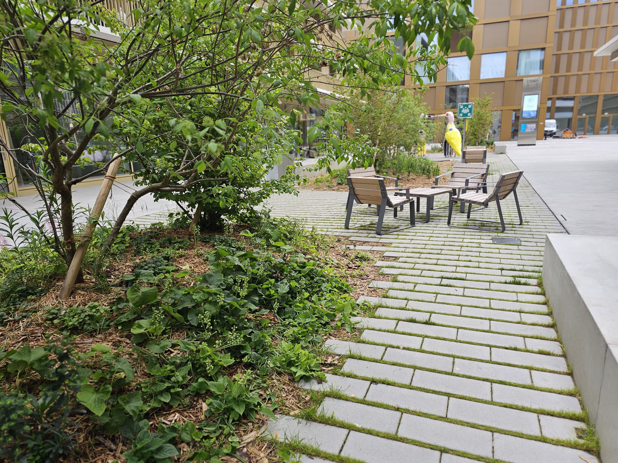 Une palette végétale herbacée et arborée est spécifiquement développée pour répondre aux conditions sur dalle.