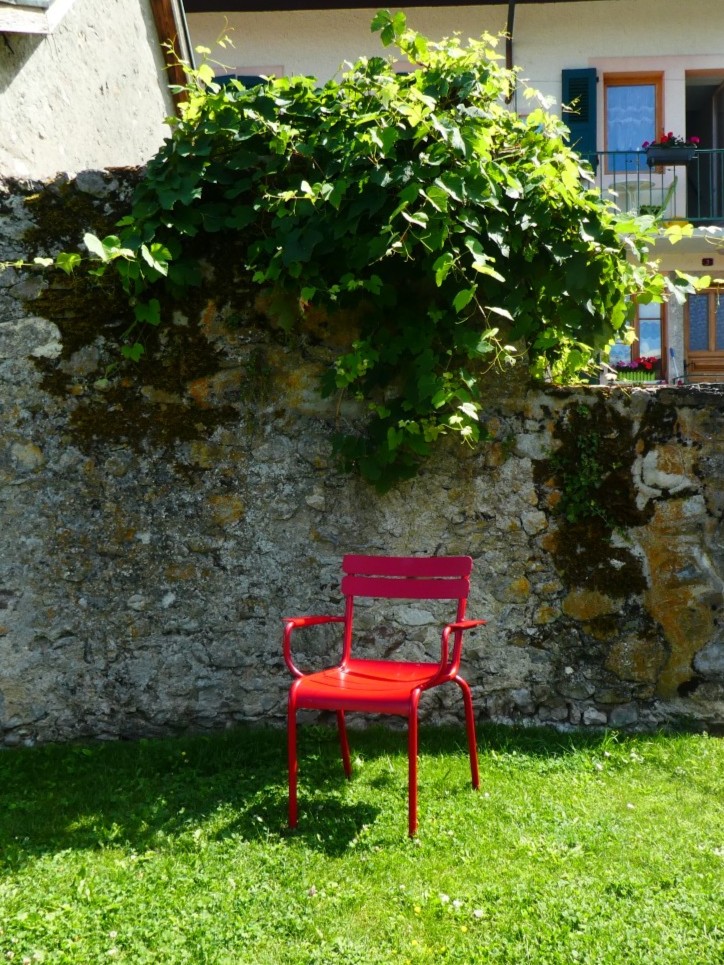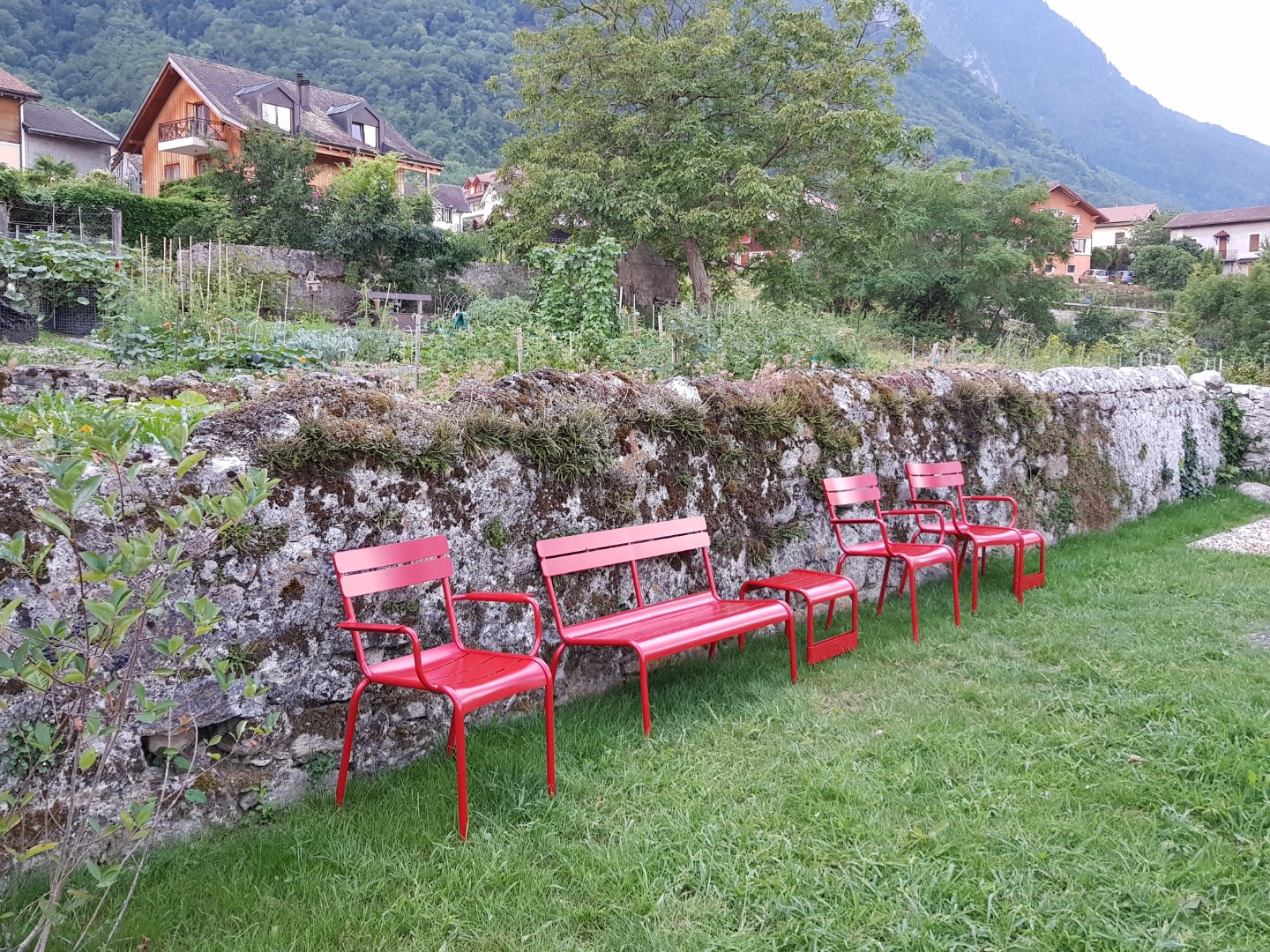 Des chaises rappelant le jardin parisien du Luxembourg sont à disposition des visiteurs, déplaçables à souhait, au gré des envies de solitude ou de socialisation, de soleil ou d’ombre. Leur teinte coquelicot a donné le ton pour unifier l’ensemble du mobilier, composé d’éléments recyclés et nouveaux : cette couleur est reprise sur les parties métalliques des jeux.