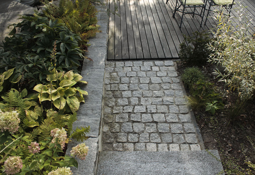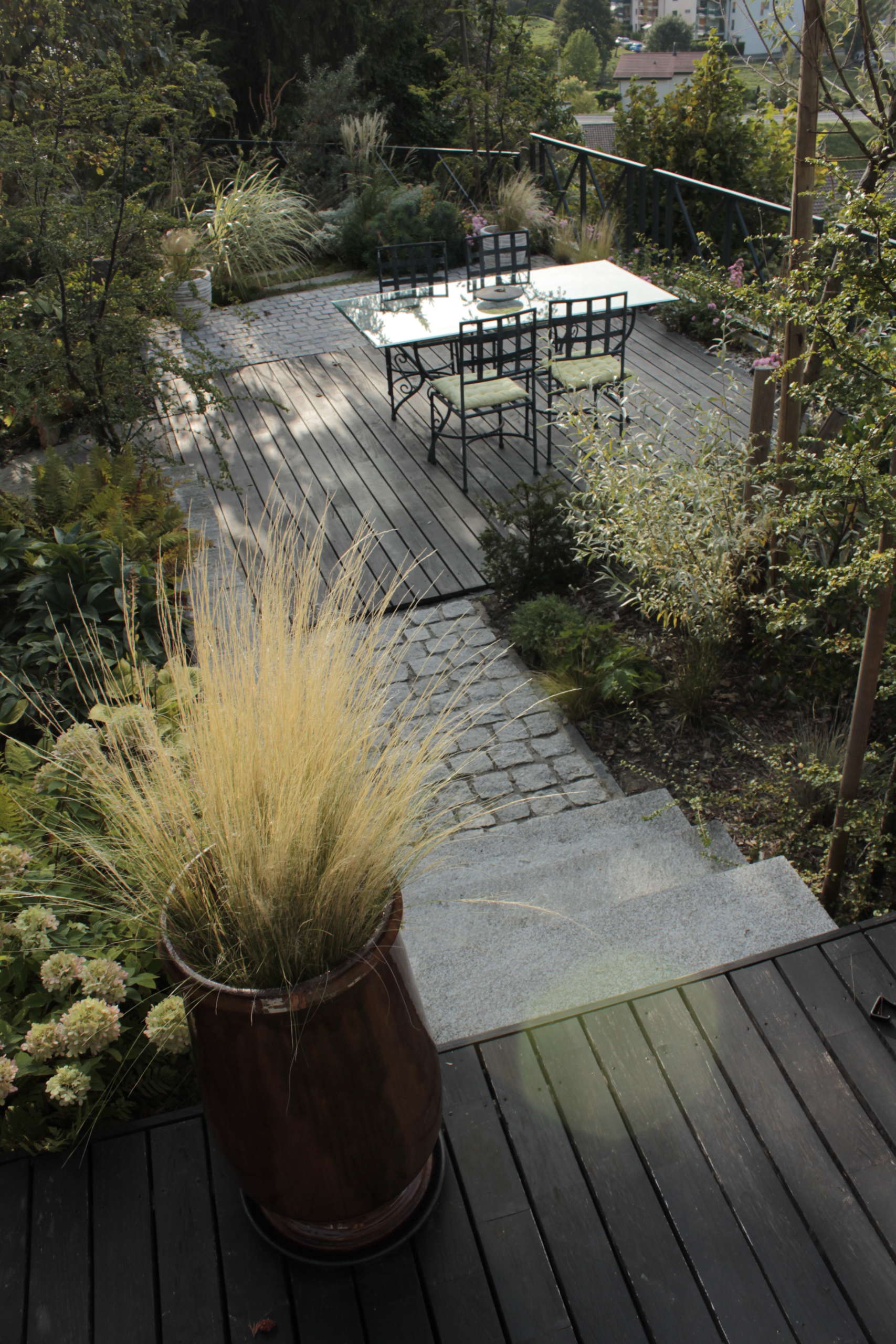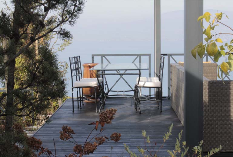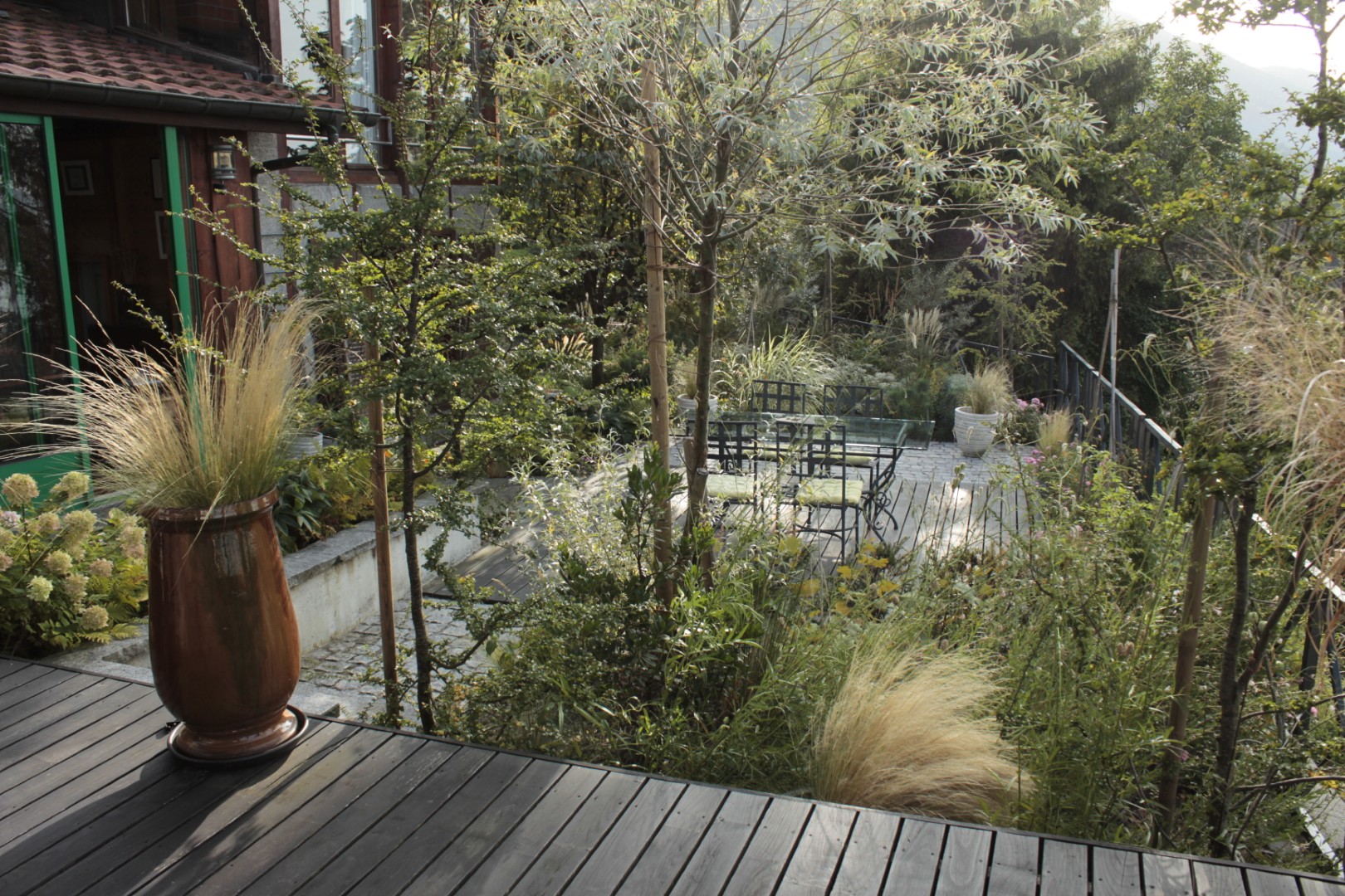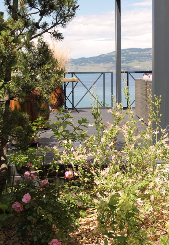 Un massif d’ombre décline les feuillages larges et découpés (rodgersias, fougères, hellebores, hostas) et offrent un attrait hivernal particulier. La richesse des différentes ambiances donne la sensation que le jardin s’est agrandit depuis l’état initial (une simple pelouse). Disposée au coeur de cette ambiance végétale foisonnante, une terrasse en bois de châtaignier verni « à la japonaise », surplombe le lac Léman.