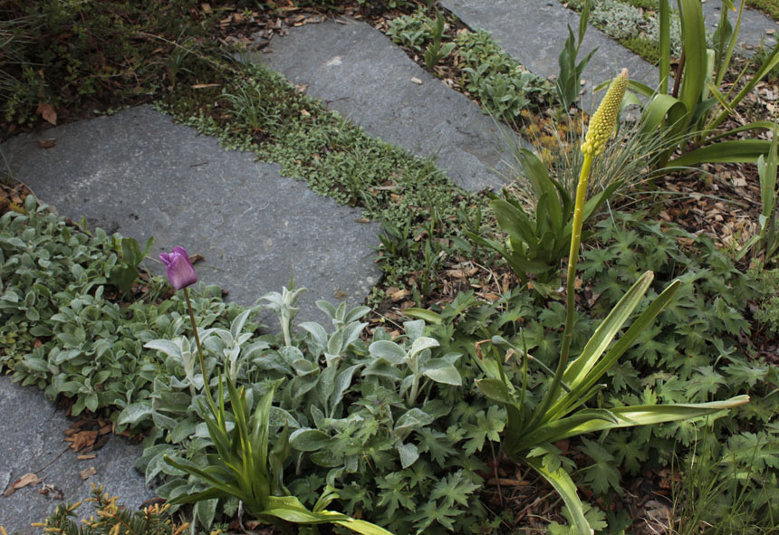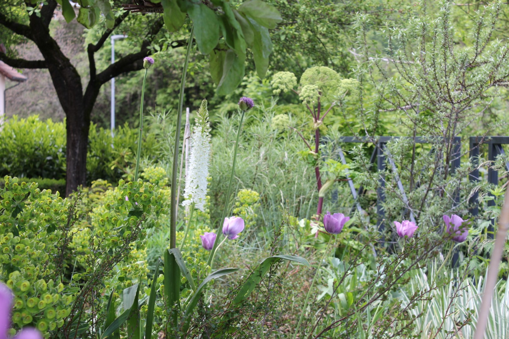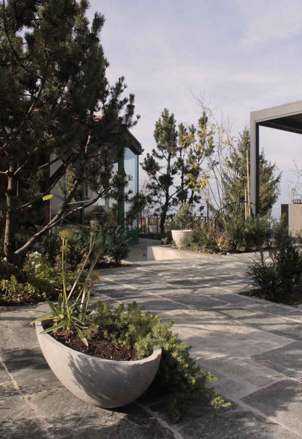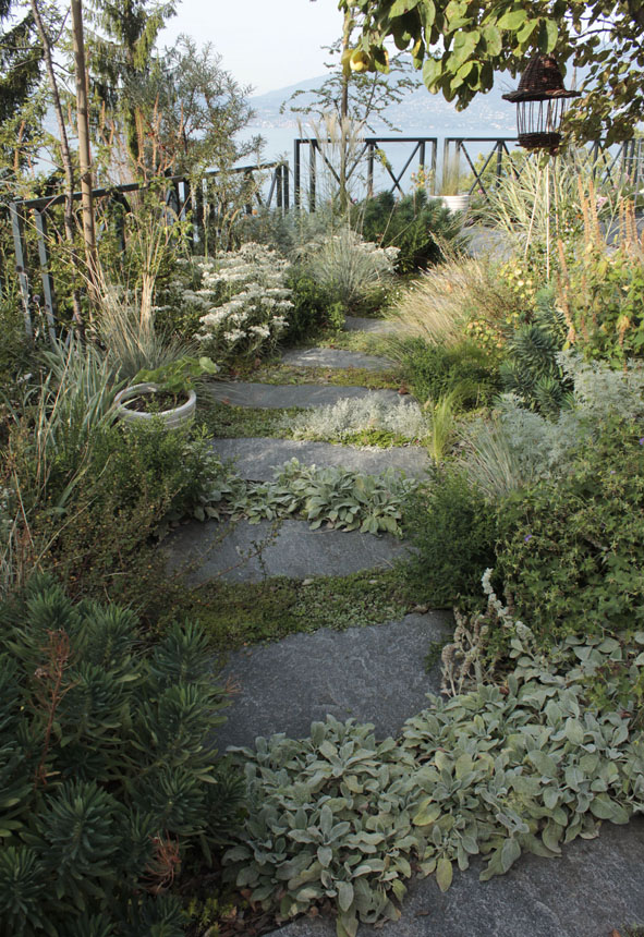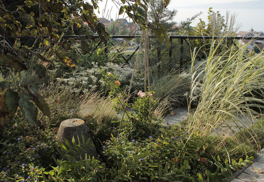 « Un jardin dans les gris-bleu, comme le lac », voilà le désir de la propriétaire. Matériaux et plantes sont choisis selon ce fil conducteur. Composé de différentes strates végétales (couvre-sol, vivaces plantées en groupes, graminées solitaires, cépées gourmandes et arbres tiges), ce jardin peut s’observer sous tous les angles.