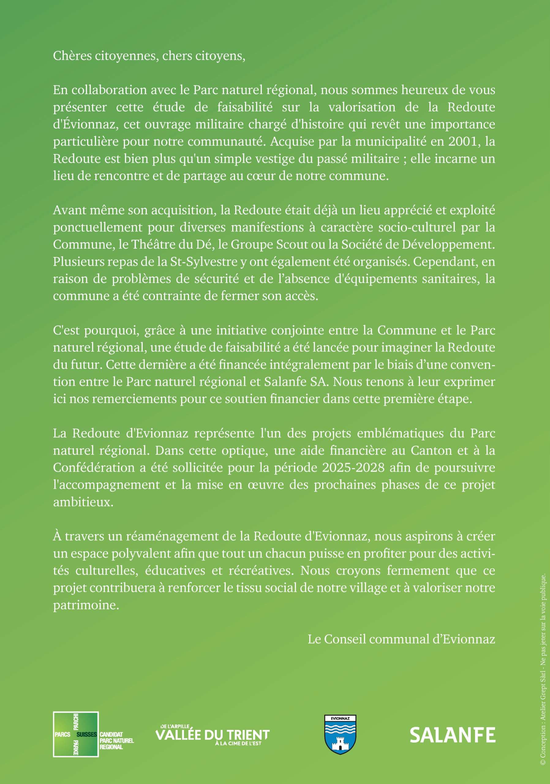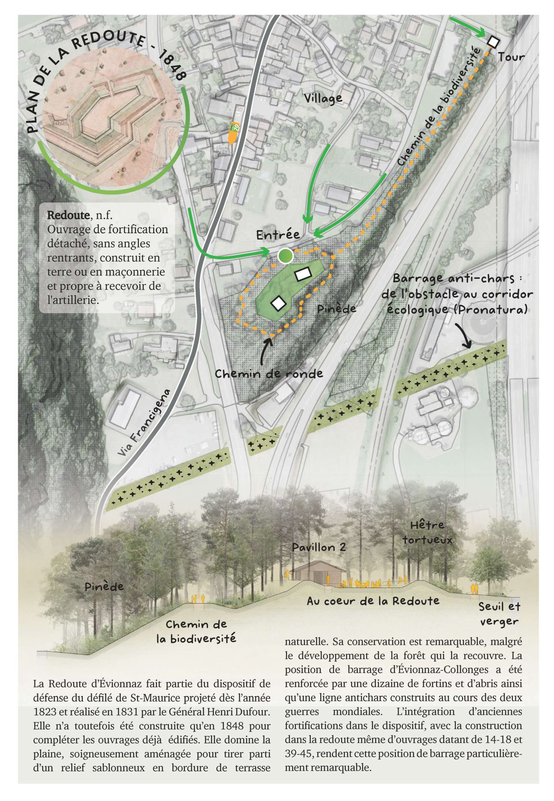 Tel un rempart dans la vallée du Rhône, la Redoute d’Évionnaz fait se rencontrer la nature et l’histoire. Ce site d’exception permet des possibilités nombreuses, tant pour les habitants de la commune et les visiteurs de passage que pour les écoles. Au cœur du Parc naturel régional, la Redoute pourrait devenir un lieu de référence, pouvant accueillir évènements, expositions et publics en quête de balades, de divertissement ou d’informations concernant l’histoire militaire de la région ou les particularités paysagères et naturelles en présence. Les critères qui ont guidé les premières réflexions étaient clairs : préserver et renforcer les particularités du site et développer ses usages.
