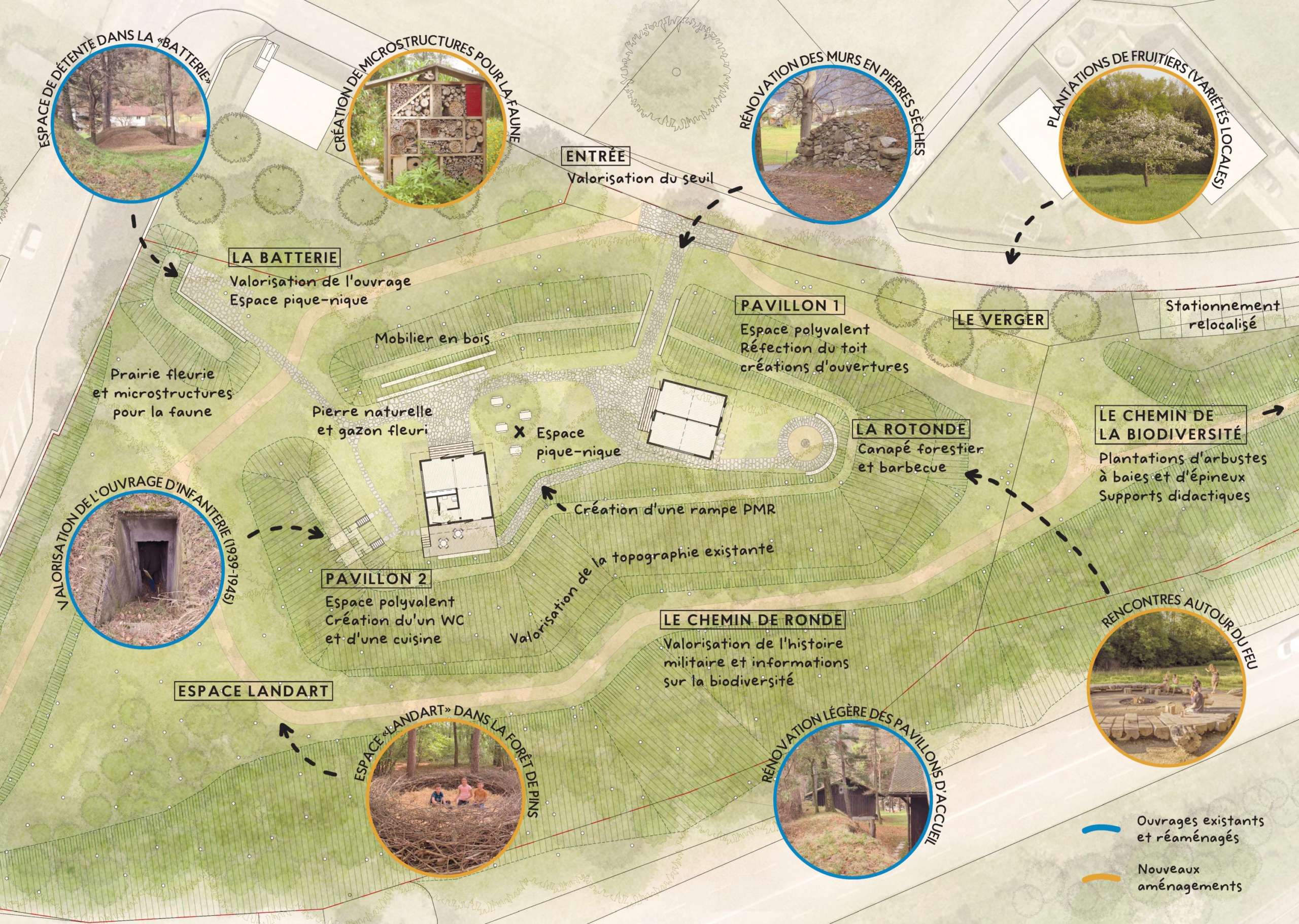 Un chemin de la biodiversité serait tracé autour de la redoute, agrémenté de nouvelles plantations d’arbustes, de microstructures pour la faune (nichoirs, abris à chauve-souris, hôtels à insectes) et de panneaux didactiques pour sensibiliser le public à la thématique. Les ouvrages militaires des différentes époques feraient également l’objet d’un parcours thématique. Les murs en pierres sèches à l’entrée du site pourraient par exemple être restaurés lors d’un atelier de construction.