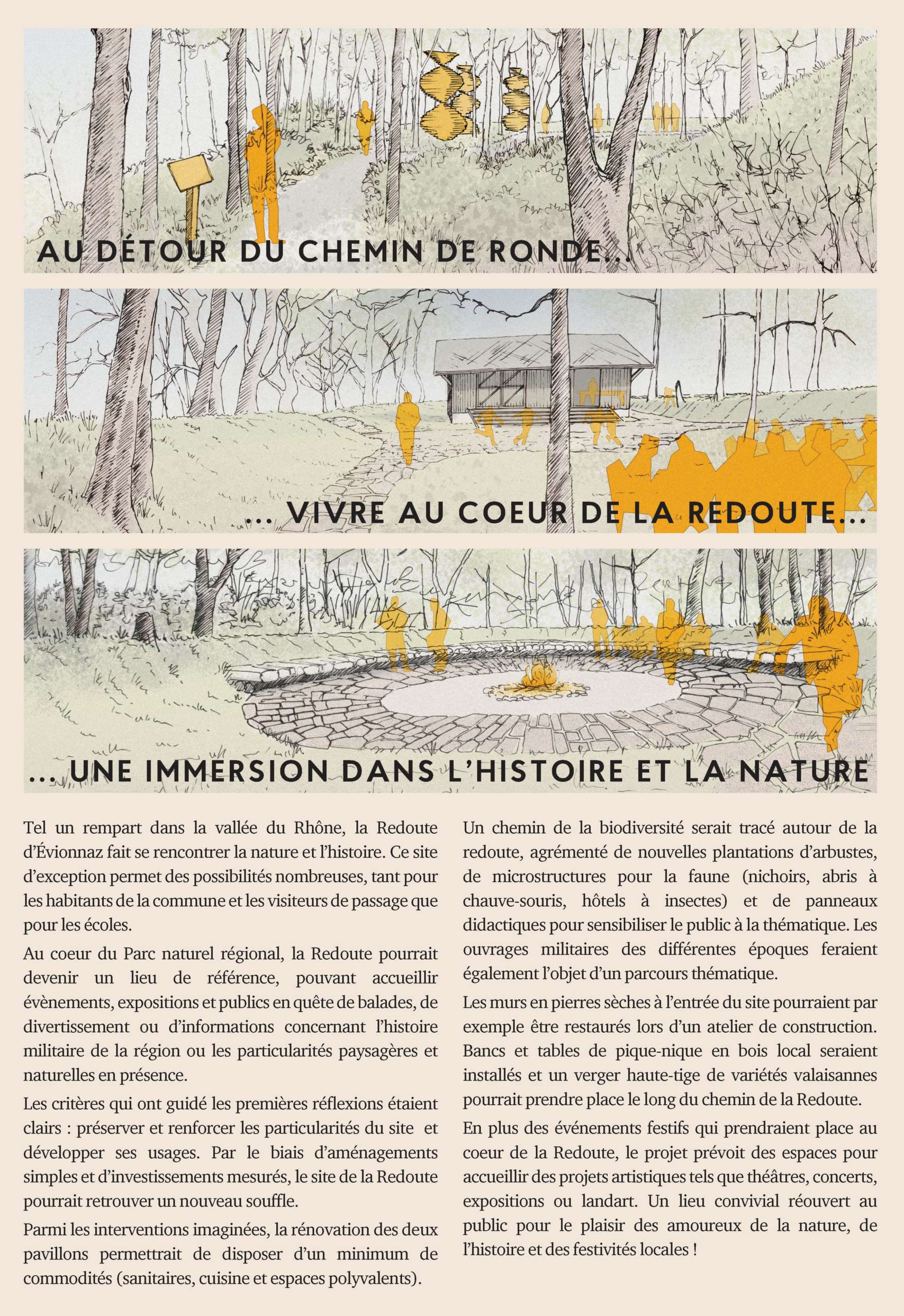 Bancs et tables de pique-nique en bois local seraient installés et un verger haute-tige de variétés valaisannes pourrait prendre place le long du chemin de la Redoute. En plus des événements festifs qui prendraient place au cœur de la Redoute, le projet prévoit des espaces pour accueillir des projets artistiques tels que théâtres, concerts, expositions ou landart. Un lieu convivial réouvert au public pour le plaisir des amoureux de la nature, de l’histoire et des festivités locales !